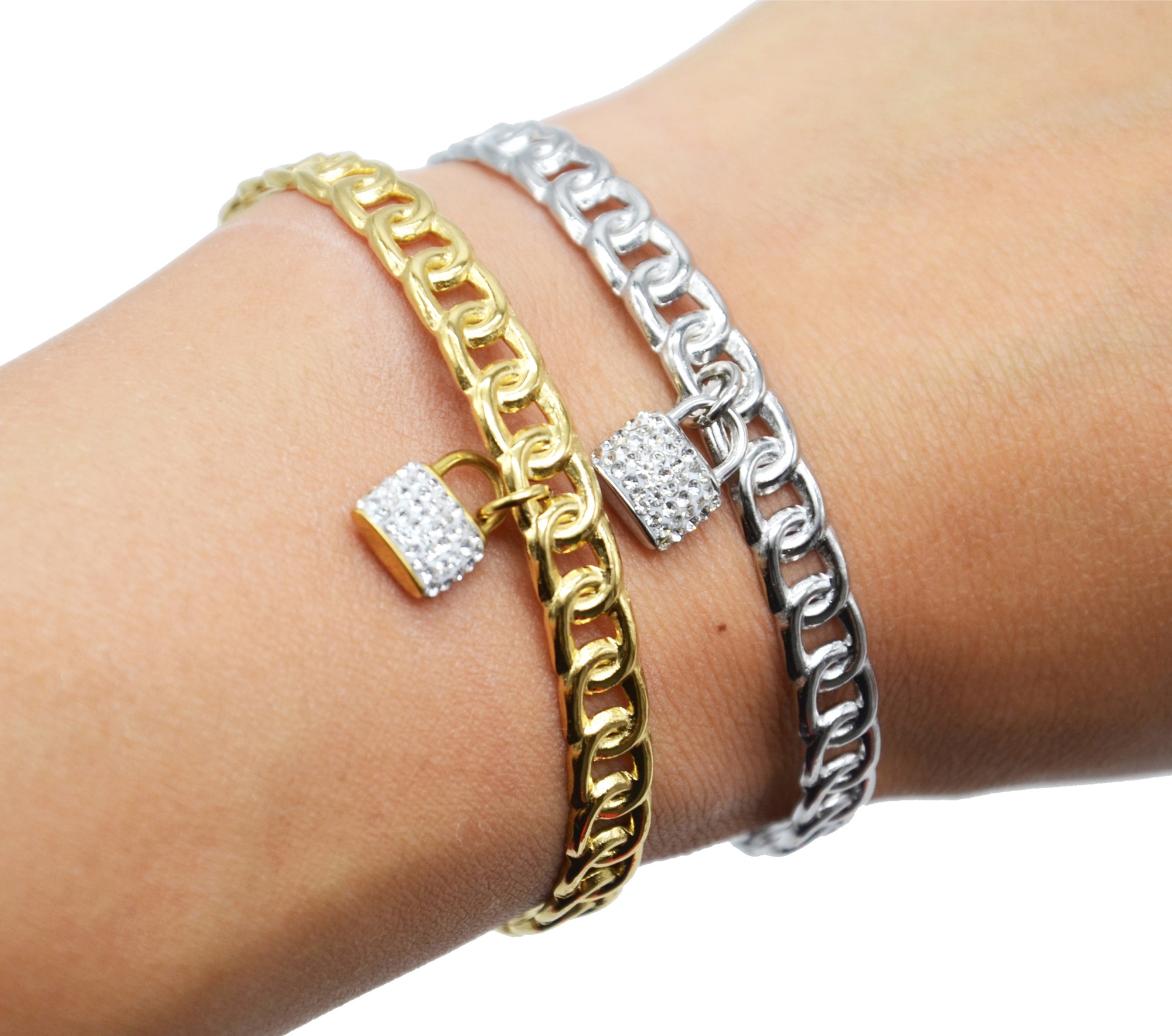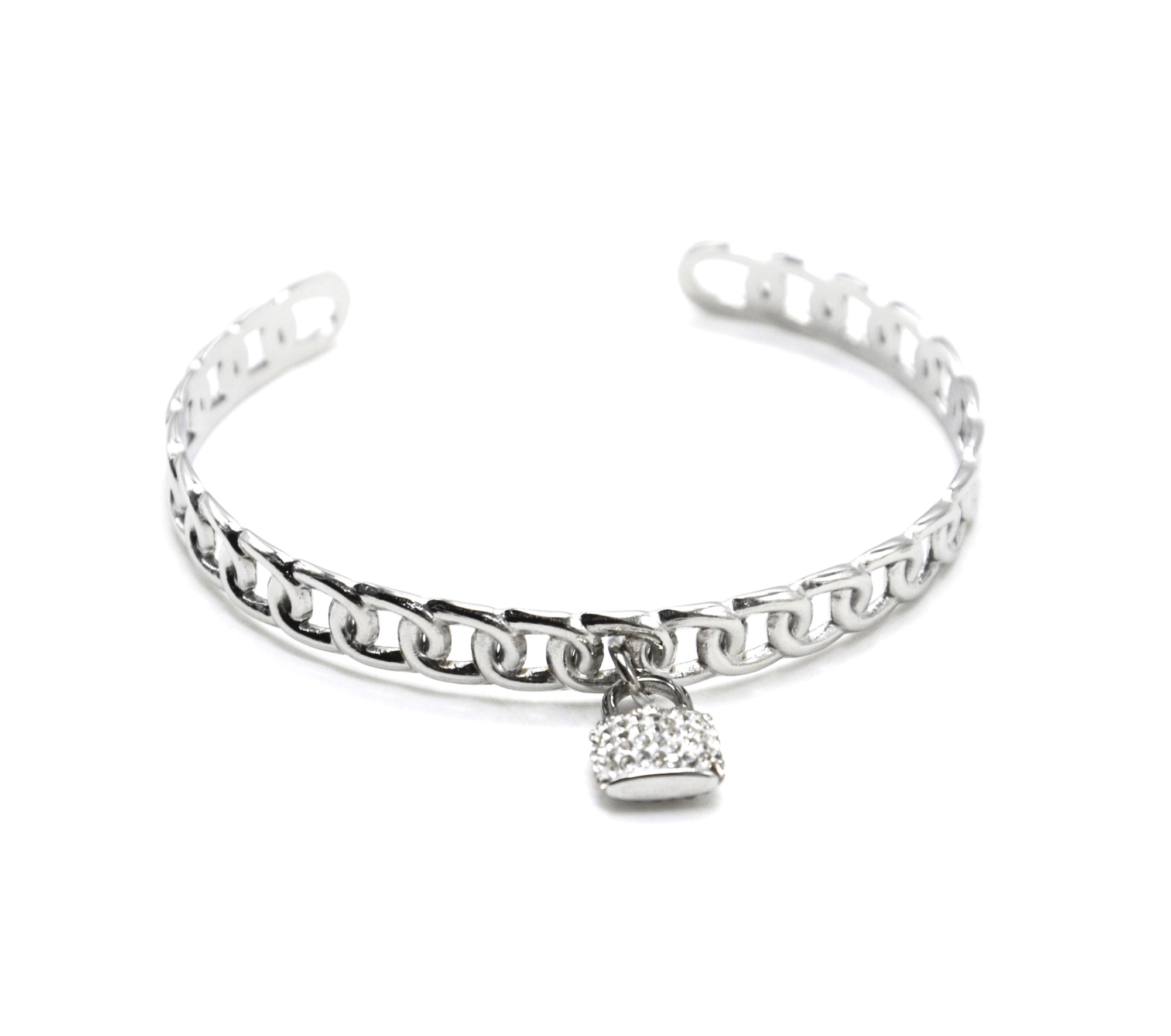 BC4155F – Bracelet Jonc Ouvert Maillons avec Pampille Cadenas Strass Acier Argenté