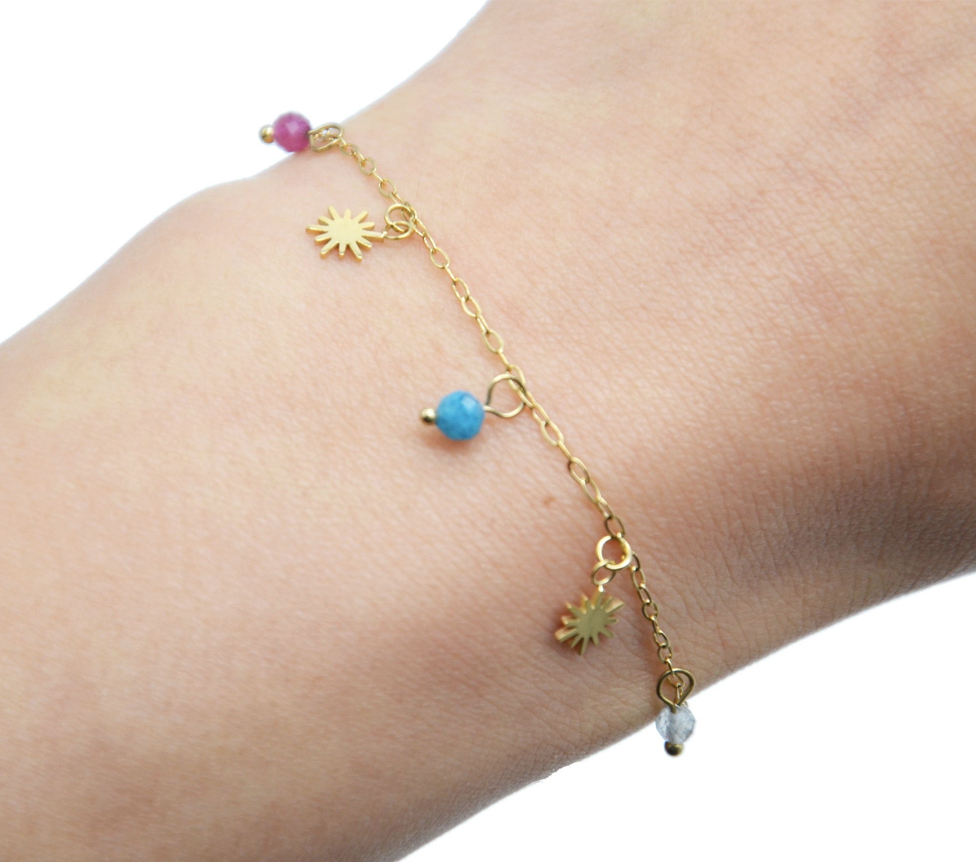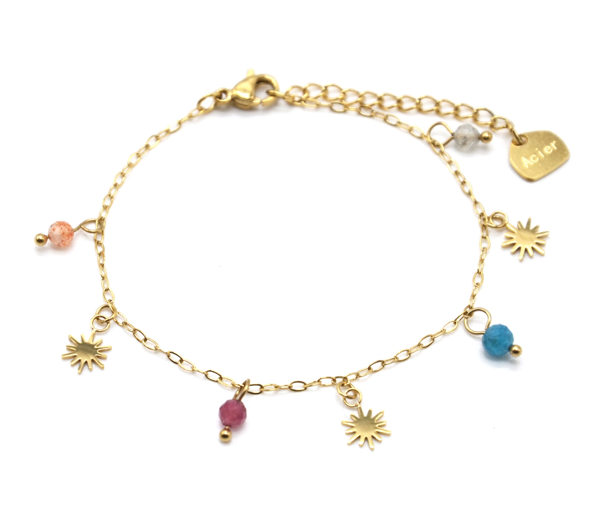 BC4320 – Bracelet Chaîne avec Pampilles Soleils Acier Doré et Pierres Multicolores