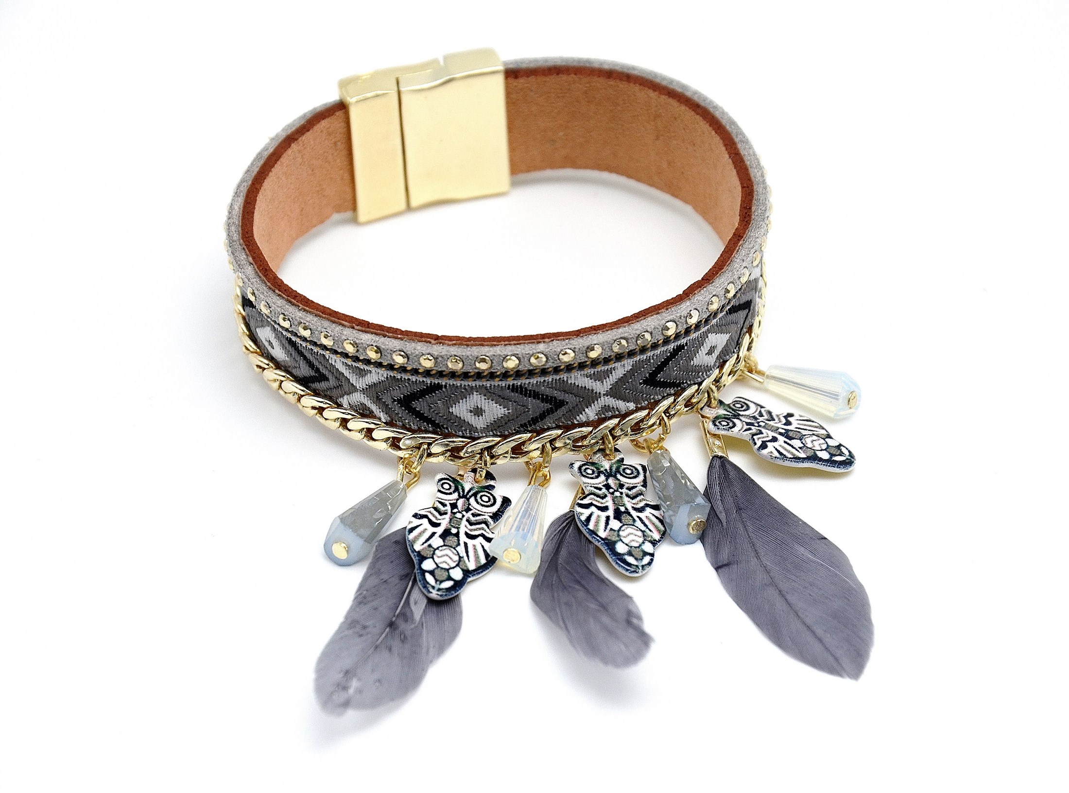 - Tour du bracelet : 19cm, Hauteur : 1.8cm (7cm avec plumes)