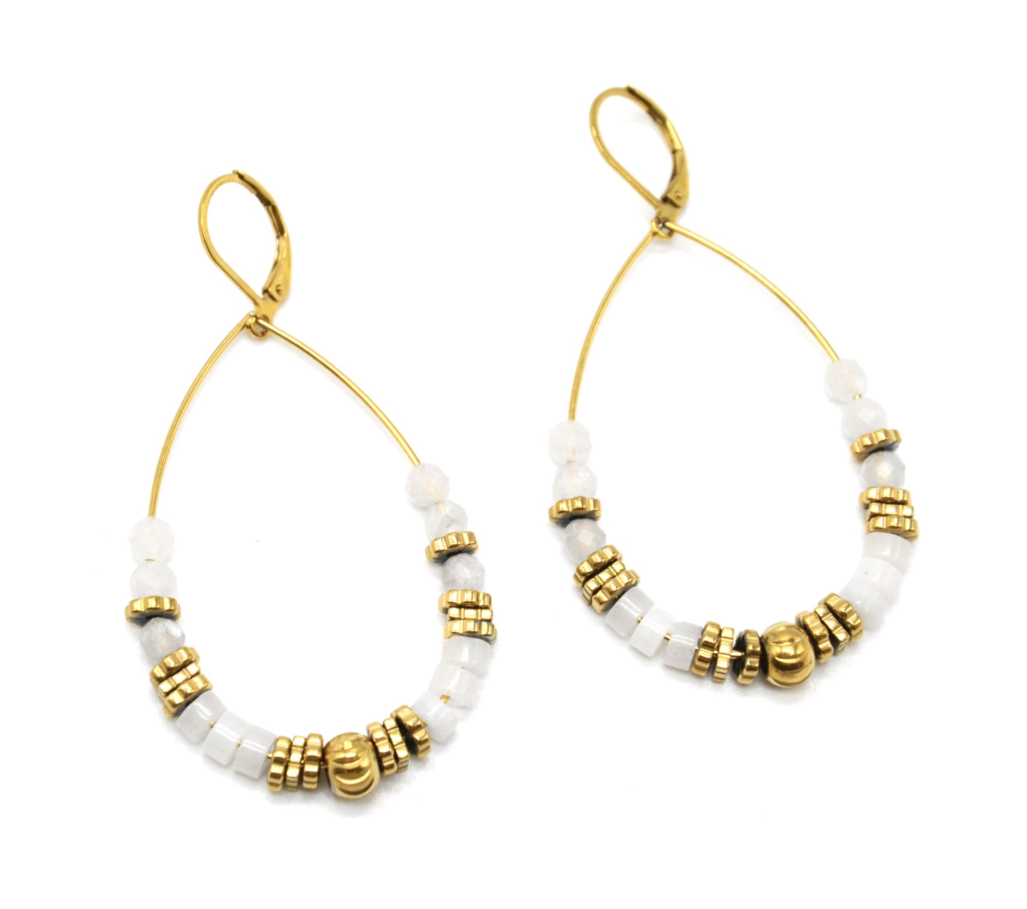 BO2273 – Boucles d’Oreilles Goutte Rondelles Acier Doré et Pierres Blanches