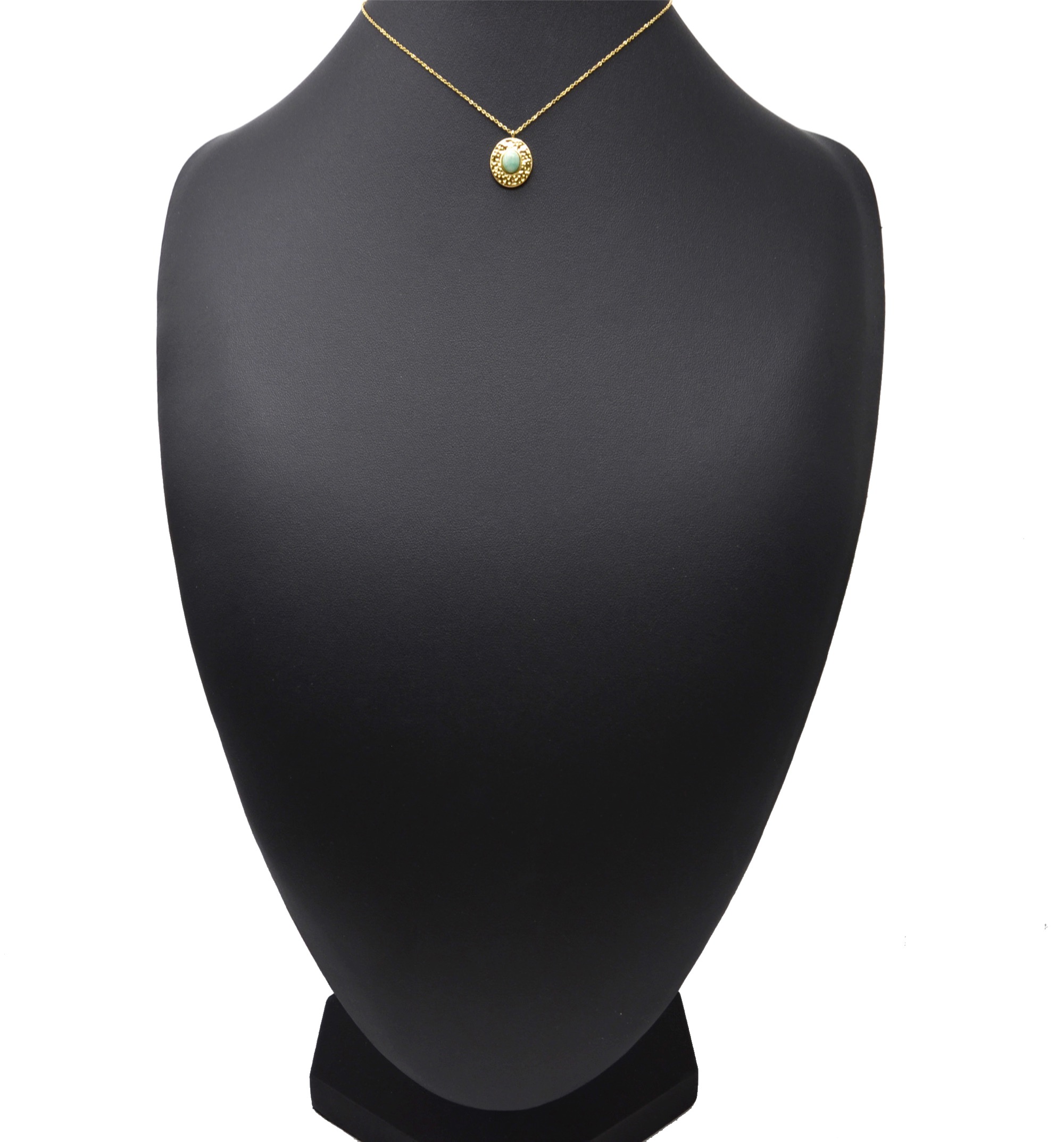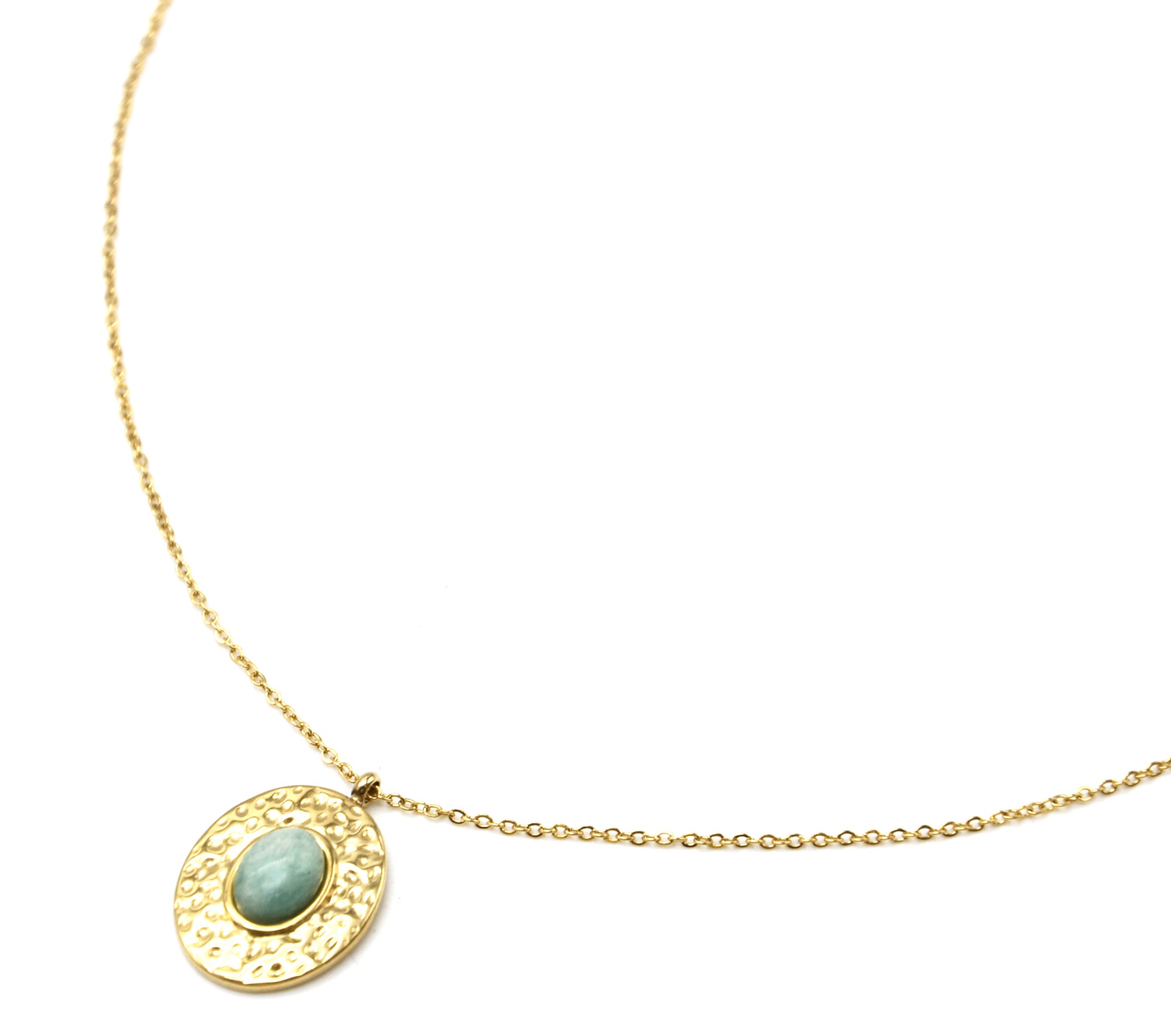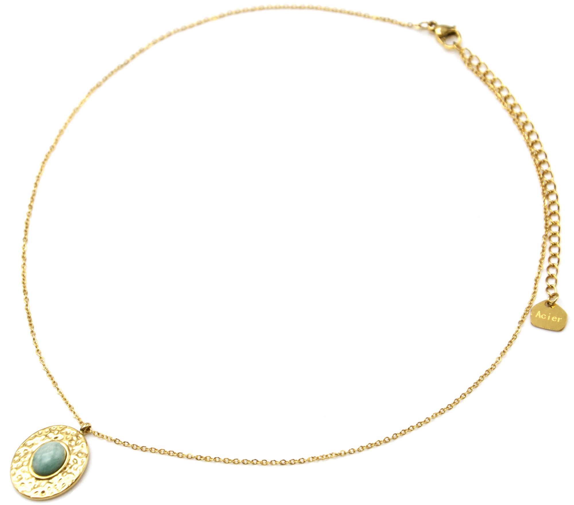 CC2767F – Collier Fine Chaîne avec Ovale Martelé Acier Doré et Pierre Vert Pale