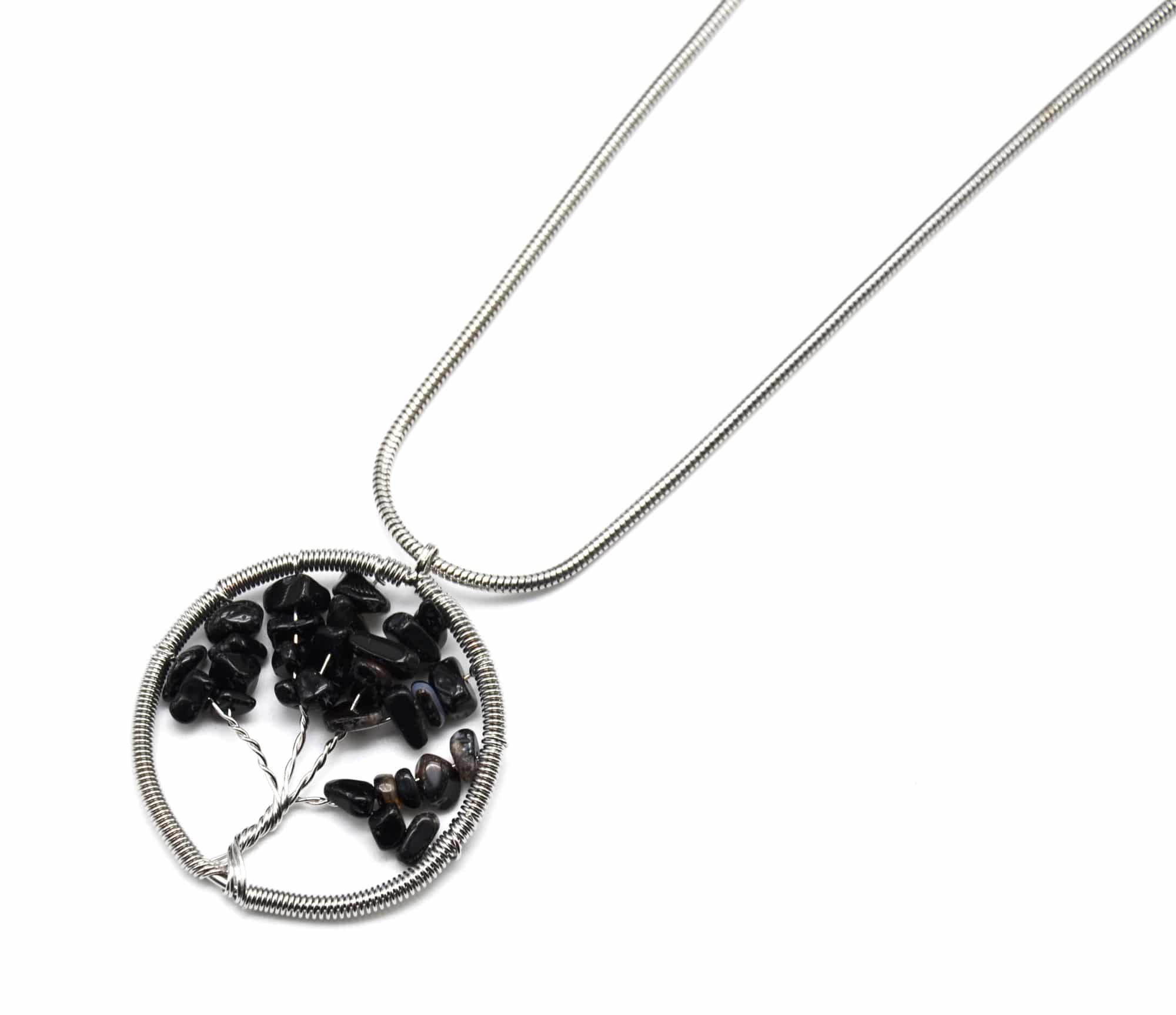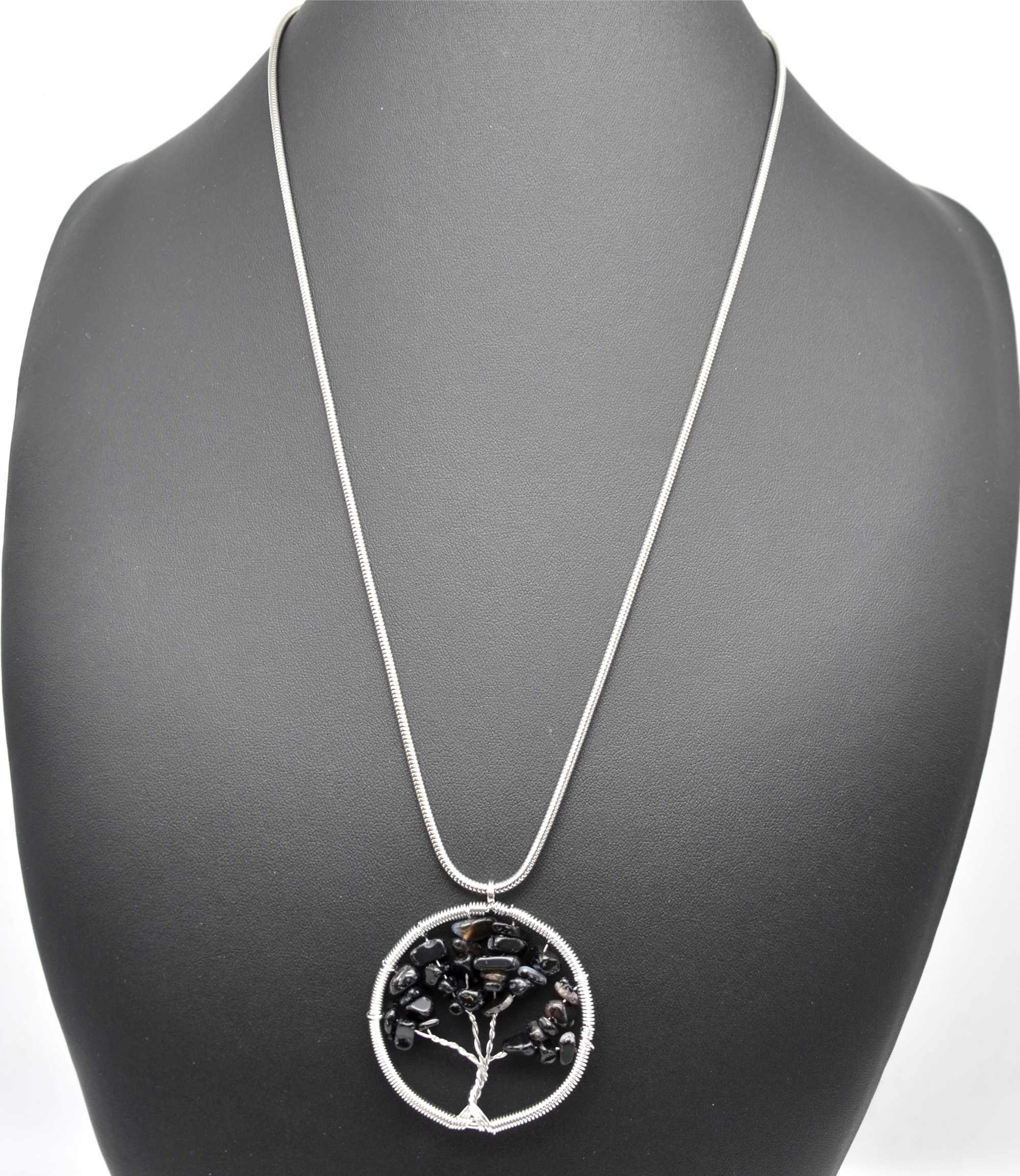 CL1179E – Sautoir Collier Pendentif Arbre de Vie Pierres Noires Contour Métal Argenté