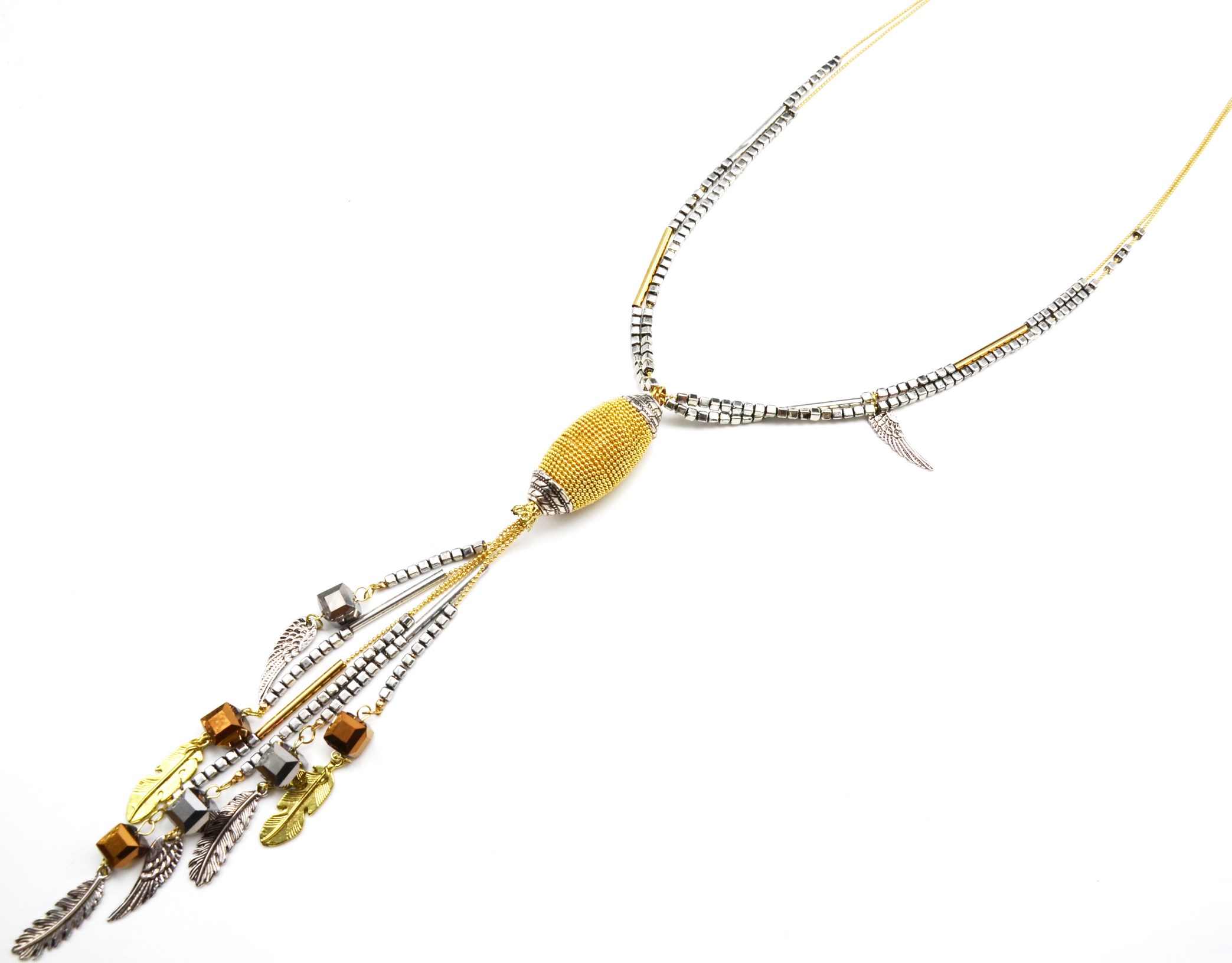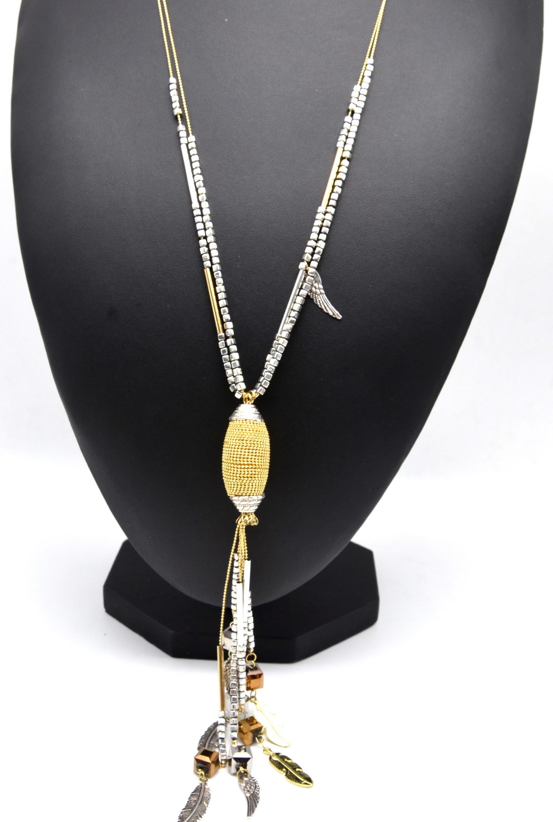 CL867E – Sautoir Collier Double Chaînes Pendentif Ovale Perles et Plumes Métal Doré/Argenté
