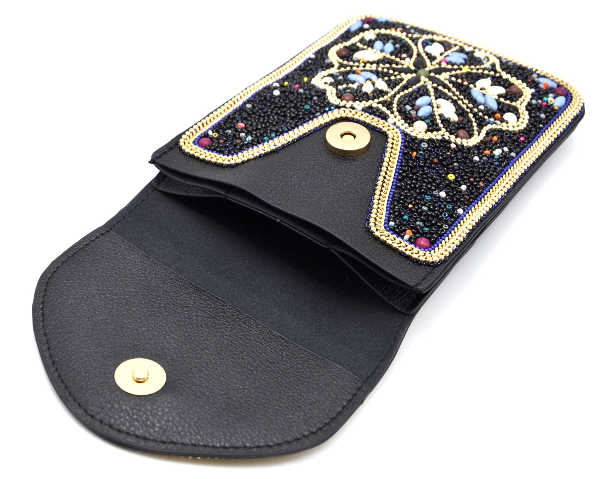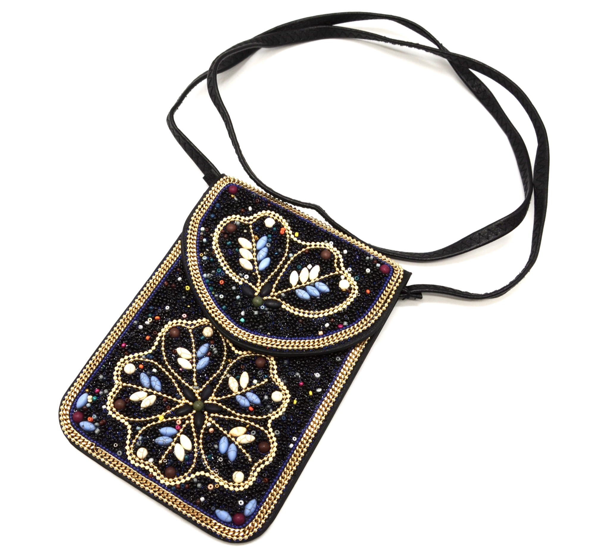 PCH21 – Mini Pochette Sac Bandoulière avec Motif Fleur Pierres et Perles Rocaille Noir