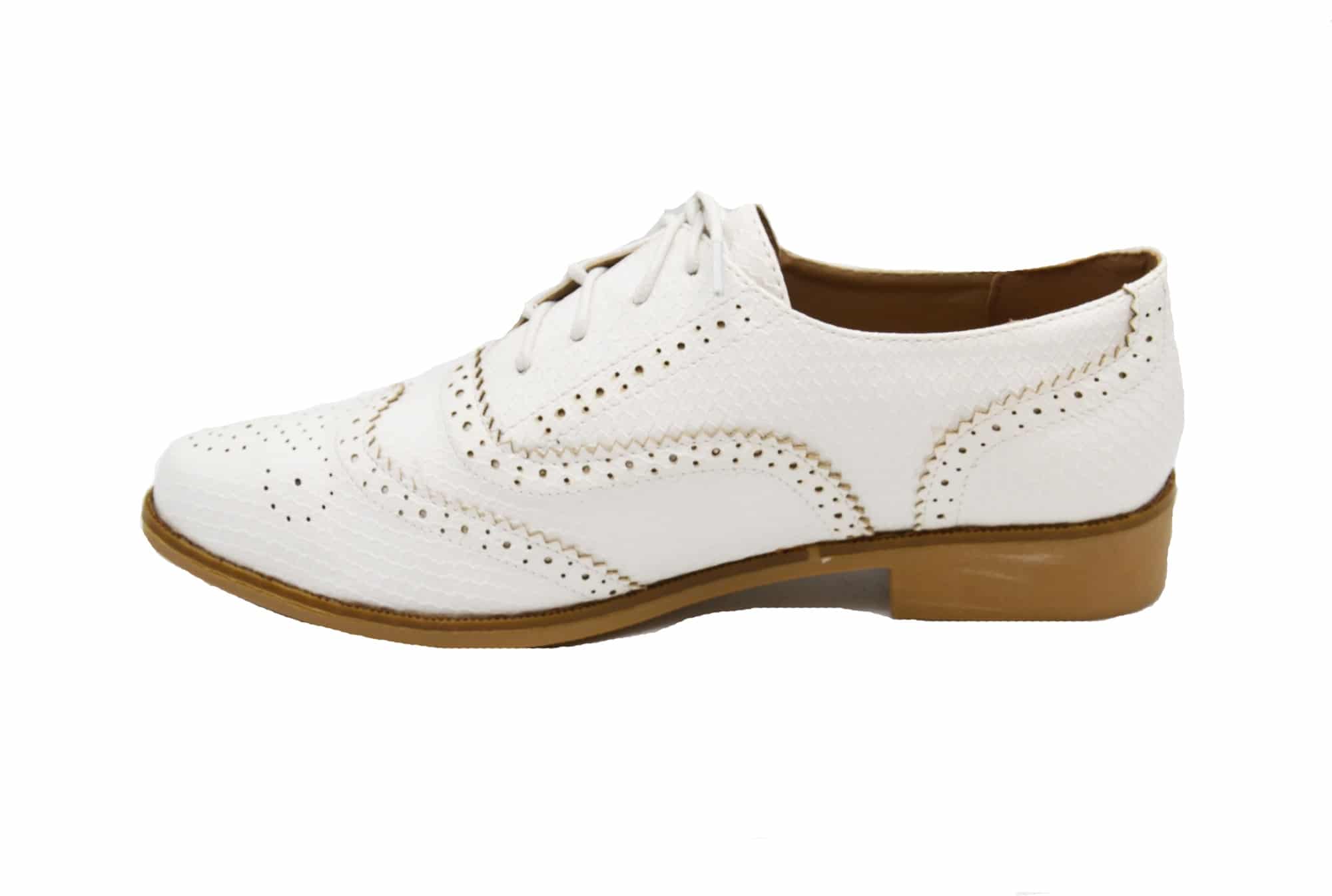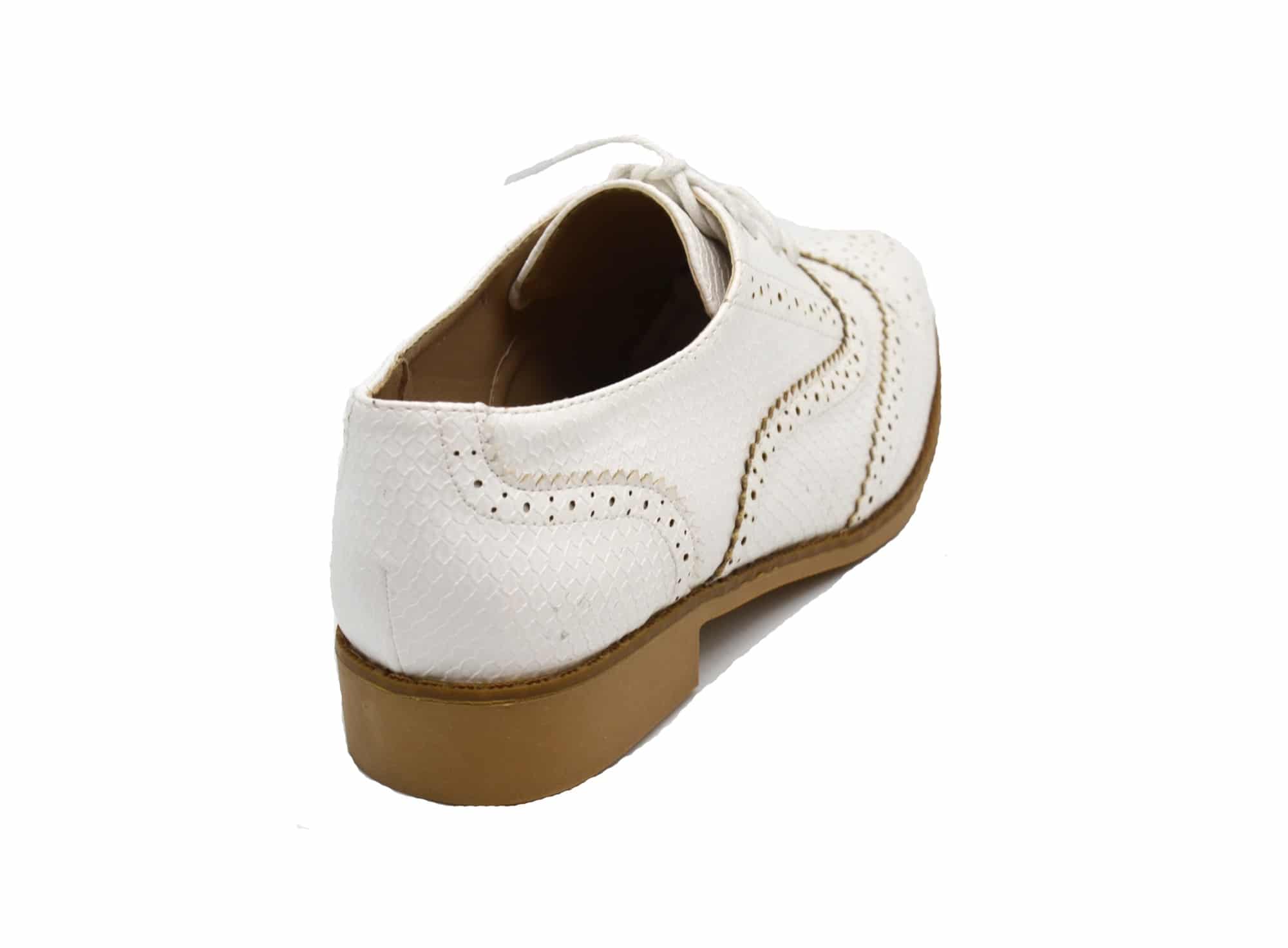Paire de derbies derby simili cuir perforé, avec motif écailles, surpiqûres, lacets et petit talon femme.